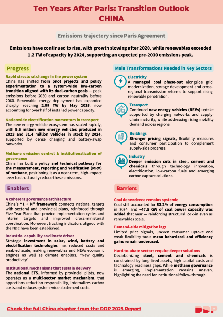 The DDP country one-pagers are a snapshot of full chapters from the 2025 report “A Decade of National Climate Action: Stocktake And The Road Ahead”